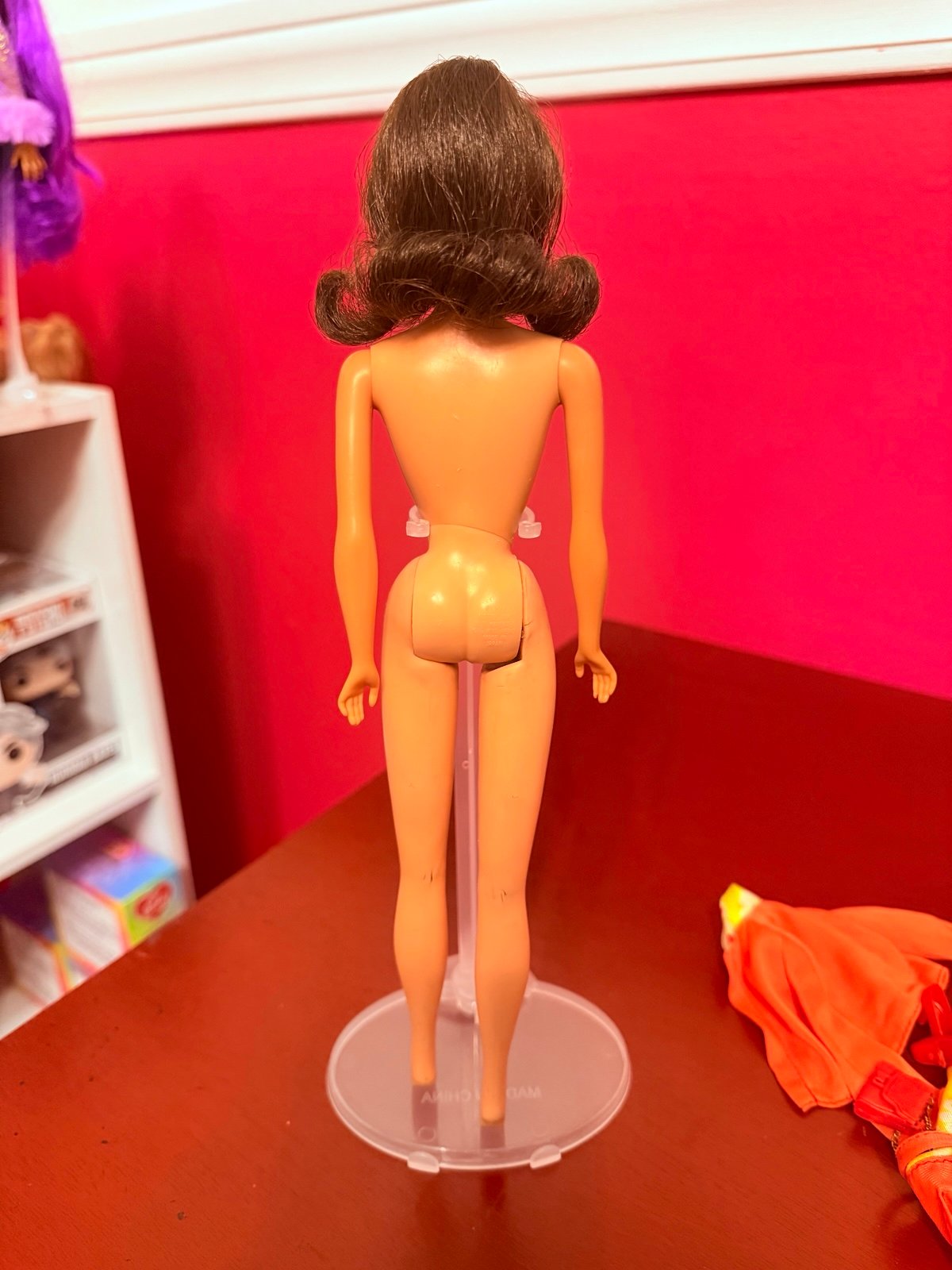 I have used TLC Marlo flip Barbie that needs a good home. She is in used condition and has some flaws. She has chews on her foot, one of her legs is loose and she has some discoloration on the body. She does display really well though. I have taken photos of the problem areas. She is wearing a full Best Buy fashion from the 1970s complete with bag and shoes. The stand is not included in this listing.