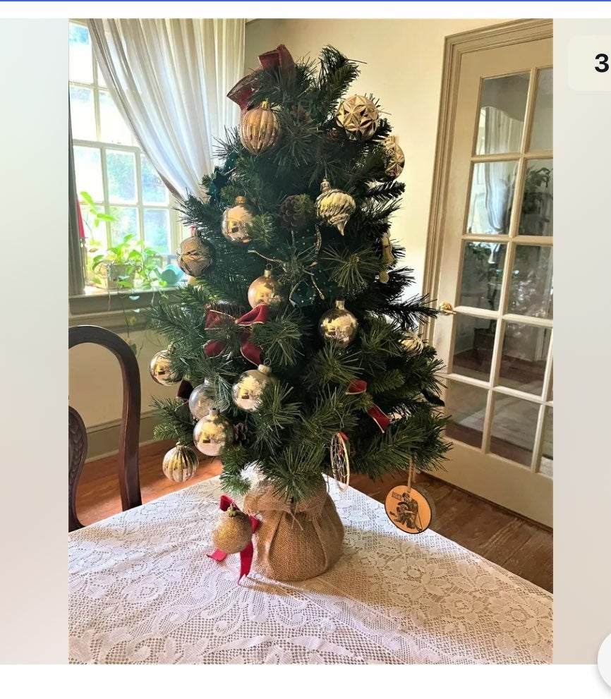 An adorable artificial Christmas tree decorated with assorted Christmas balls, ornaments, pine cones and bows with cute red bow on a burlap base. The tree is topped with a red and green Christmas bow and is 33" tall, 19" wide and the perfect tree for a small space or a centerpiece! Please see photos for details as they are part of the description.