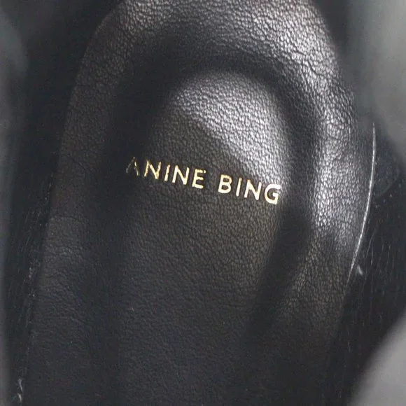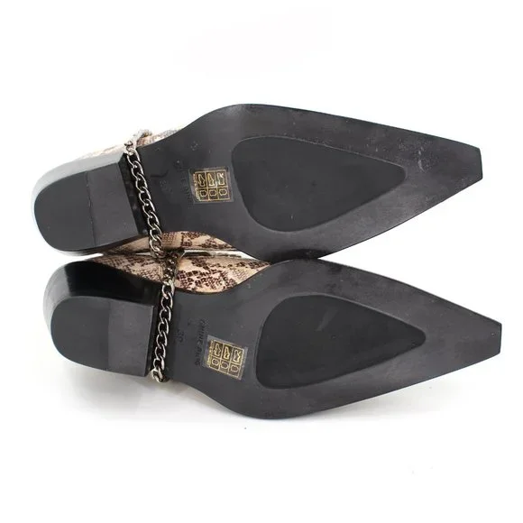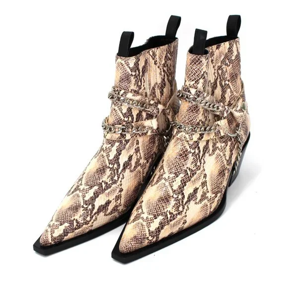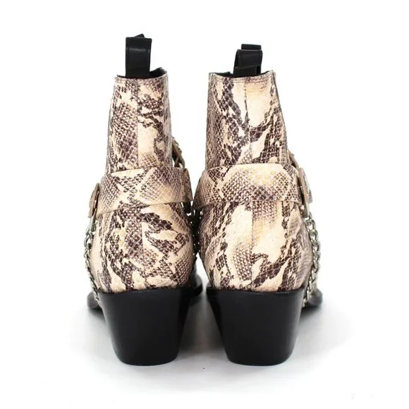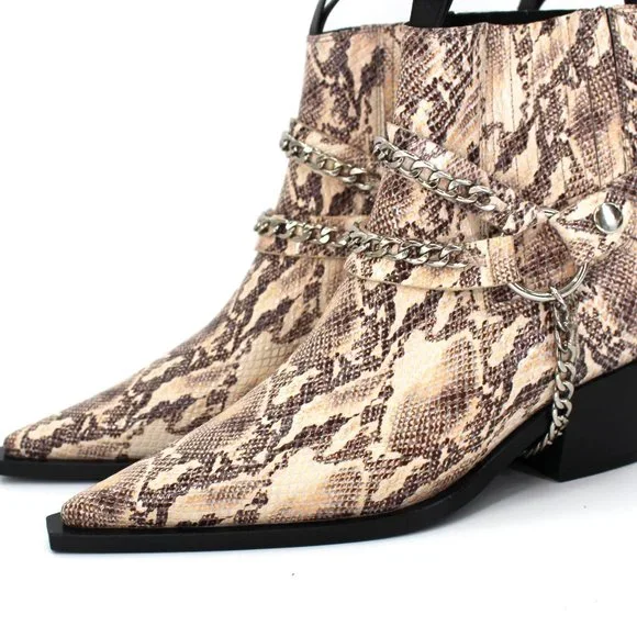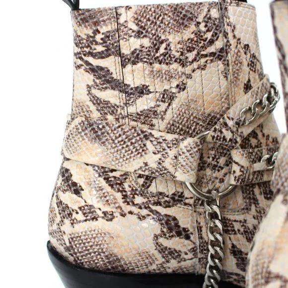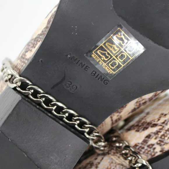 Anine Bing Harris Leather Python Embossed Pull On Ankle BootieNew in the box with the dust bagStyle: HarrisSize: 39 (US 9)Material: 100% leatherSilver tone hardwareInsole: 100% leatherSole: 100% leather /RubberAnine Bing "Harris" pull-on ankle bootiePython embossed snakeskin leather in cream & brown Silver tone chainlink detail with harness loopBlack leather pull tabs in front & backSides with elastic stretch for circumference fitPoint toe sits on a squared off platform bedStacked heelNew in the box with the dust bag, never worn!Approx. Measurements:Heel Height: 2"Total Shaft Height: 7.5"