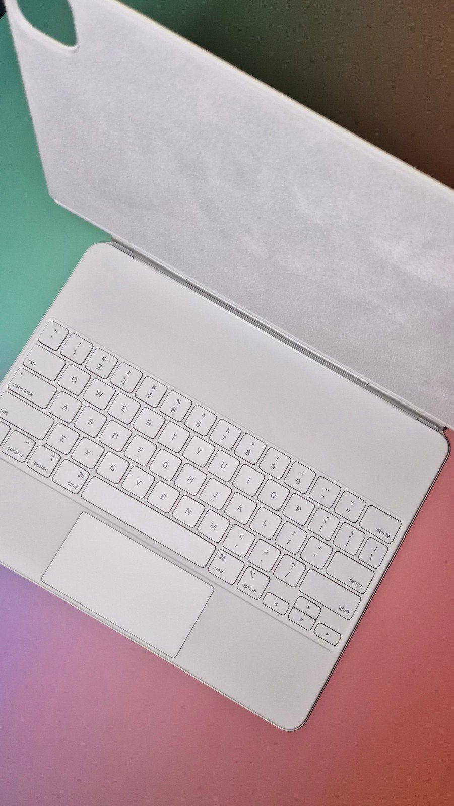 Original Apple Magic Keyboard in white color, US English layout. Compatible with iPad Pro 12.9-inch (3rd, 4th, 5th, and 6th generation) models.