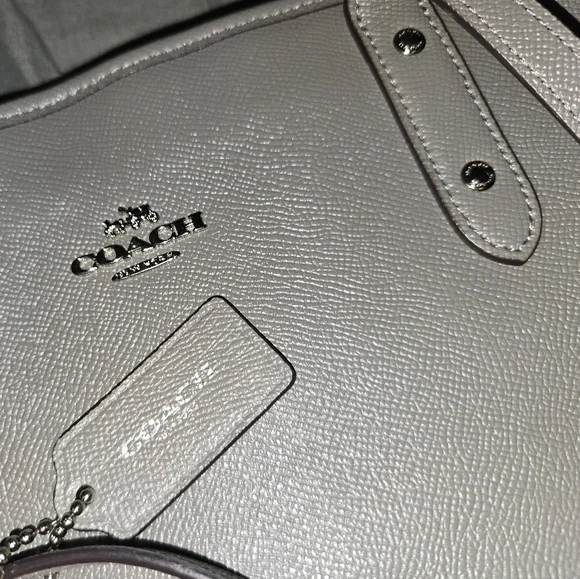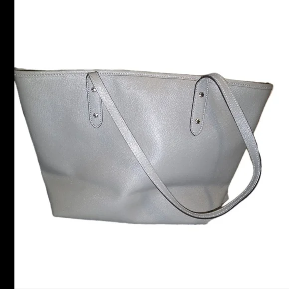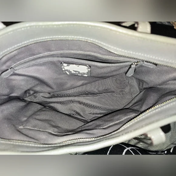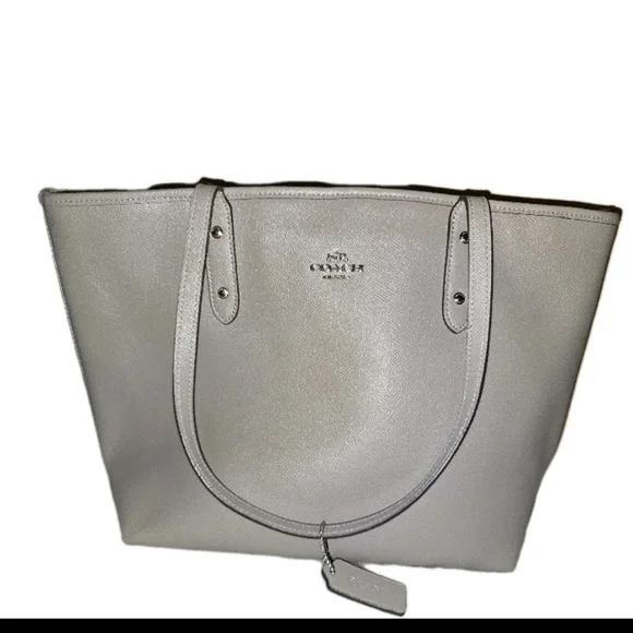 Elevate your style with the Coach Silver Tote Bag. This cute accessory is perfect for any occasion, offering both functionality and sophistication. The sleek silver color adds a touch of luxury to your ensemble. This tote is large enough to fit so much! The exterior is clean, but please note the peeling to the inside tag.