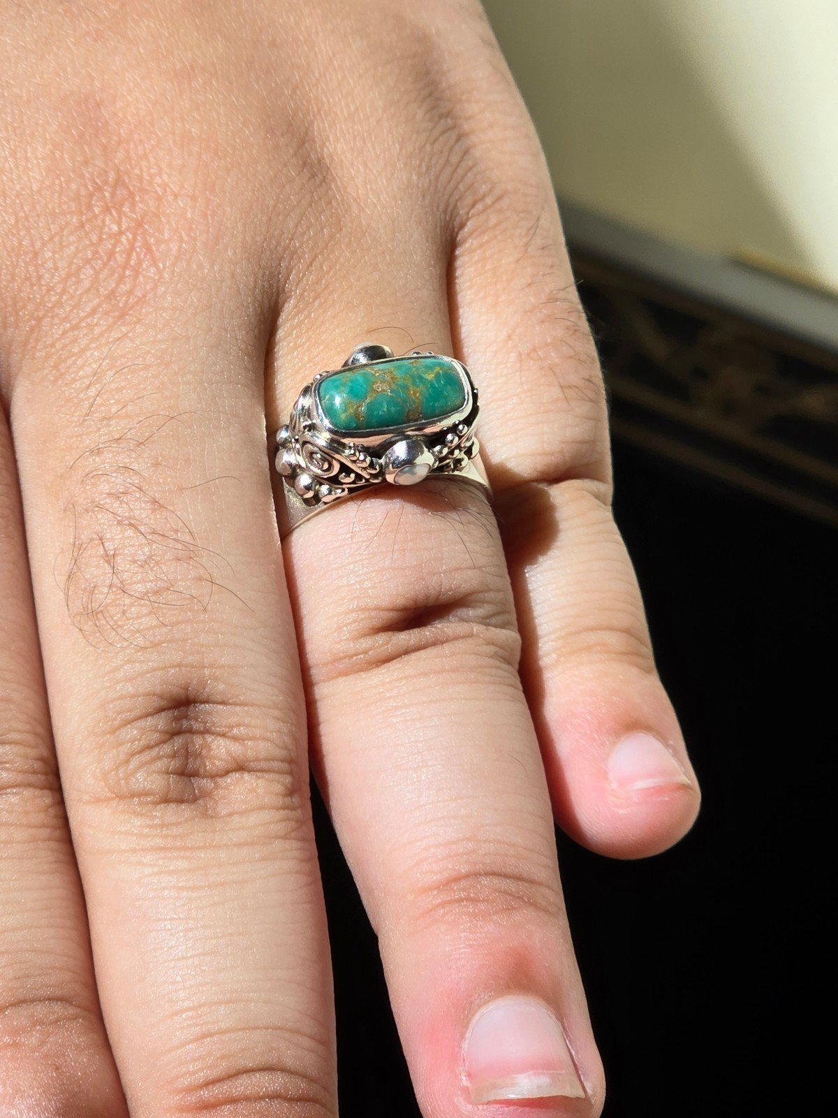 Description: Elegance awaits. This captivating sterling silver ring features a mesmerizing turquoise stone alongside a dazzling center stone, creating a look that's both sophisticated and eye-catching. Perfect for adding a touch of brilliance to any outfit.