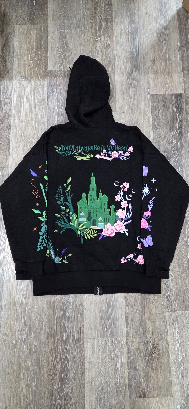 Got one short day in Emerald City? Keep cozy with these two good friends... wait no, two best friends! This embroidered zip-up hoodie features one side full of Elphaba details and the other side with Glinda details. More icons are printed down the sleeves and the back side has the palace of Oz with more embroidery and "You'll always be in my heart" stitched up top.