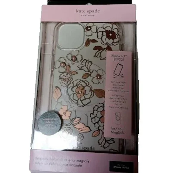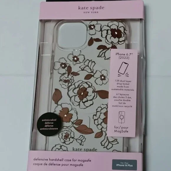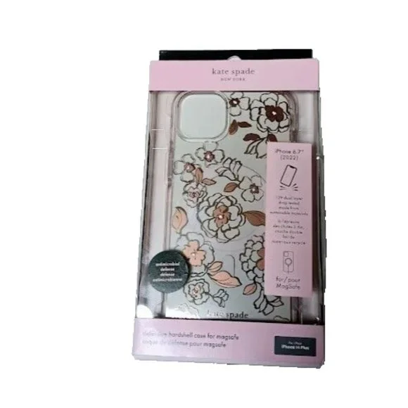 Introducing the kate spade new york Hardshell Magsafe Case for iPhone 14 Plus. This stylish and durable cover is the perfect addition to your cell phone accessories collection. Designed specifically for Apple iPhone 14 Plus, this case is compatible with Magsafe technology and features a hardshell exterior to protect your phone from daily wear and tear. The cover is adorned with the iconic kate spade new york design and is available in various colors and patterns to suit your personal style. Not only does it provide protection for your phone, but it also adds a touch of elegance and sophistication. Elevate your phone game with this must-have accessory.New in Package #562