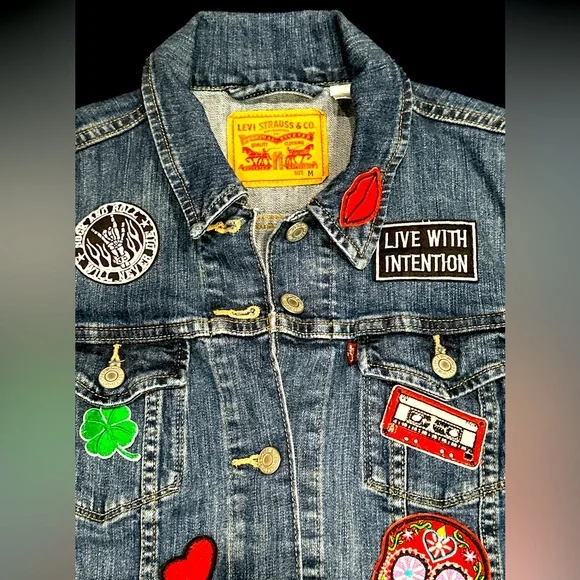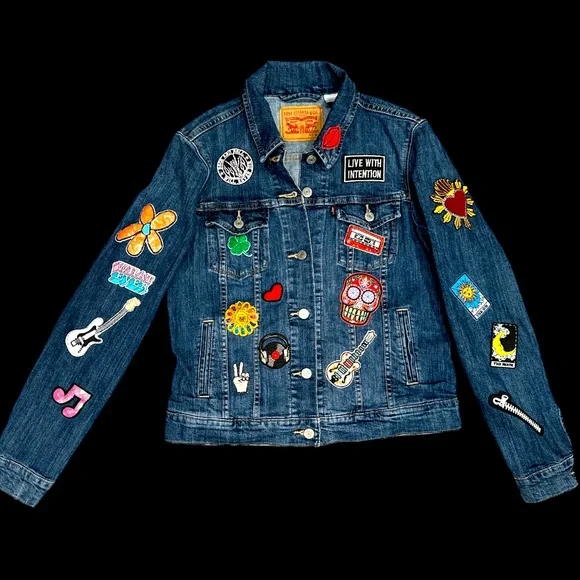Levi's denim jacket with patches. All patches are hand sewn on, which will stay on forever with proper care. Size medium. Check out my closet for other items with hand sewn on patches and embellishments. I also offer customized items with different themes, sizes and styles. "Define your personality through your jeans" and let me make a pair for you. All items are one of a kind. Jacked_Up_Jeans