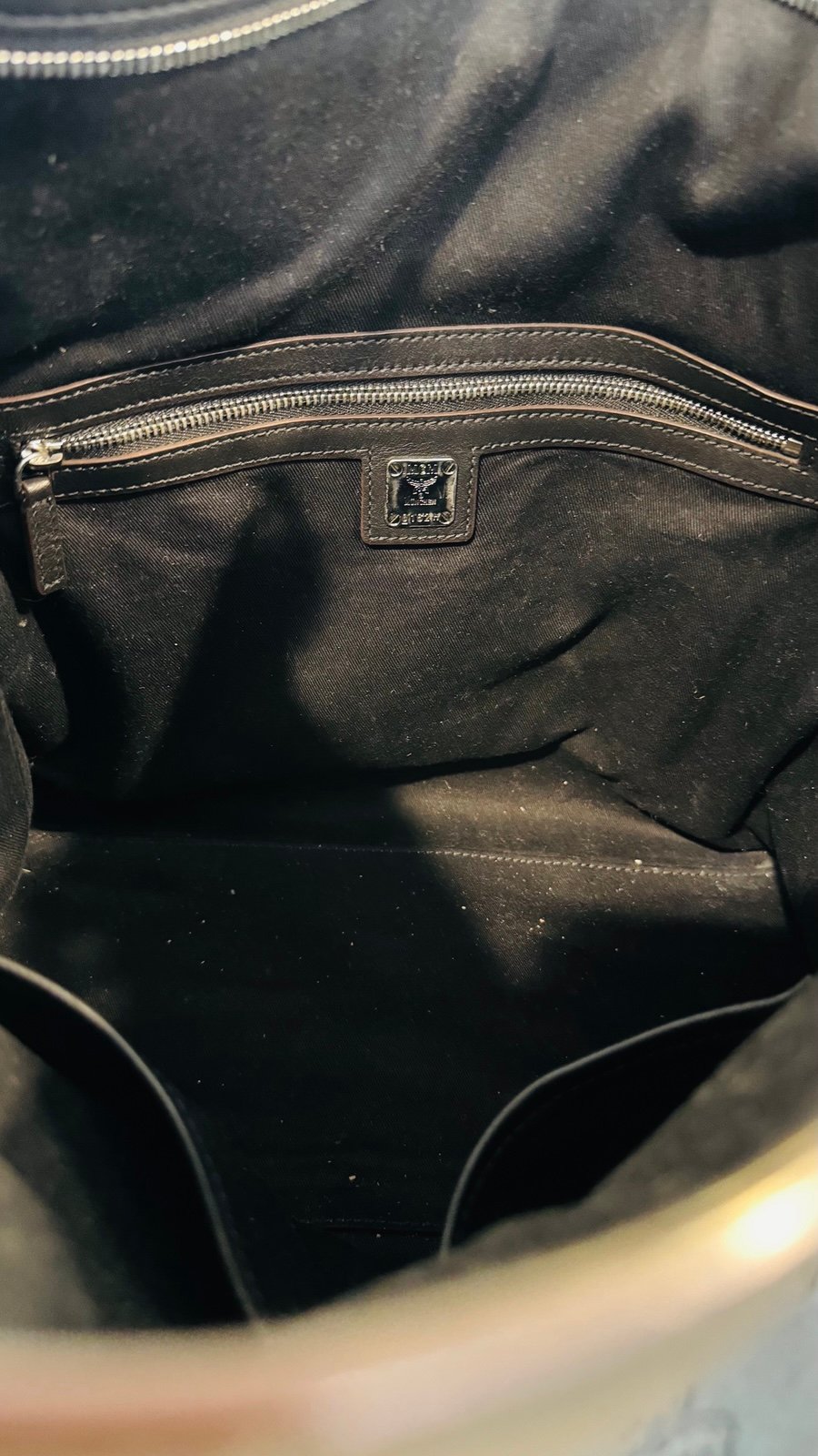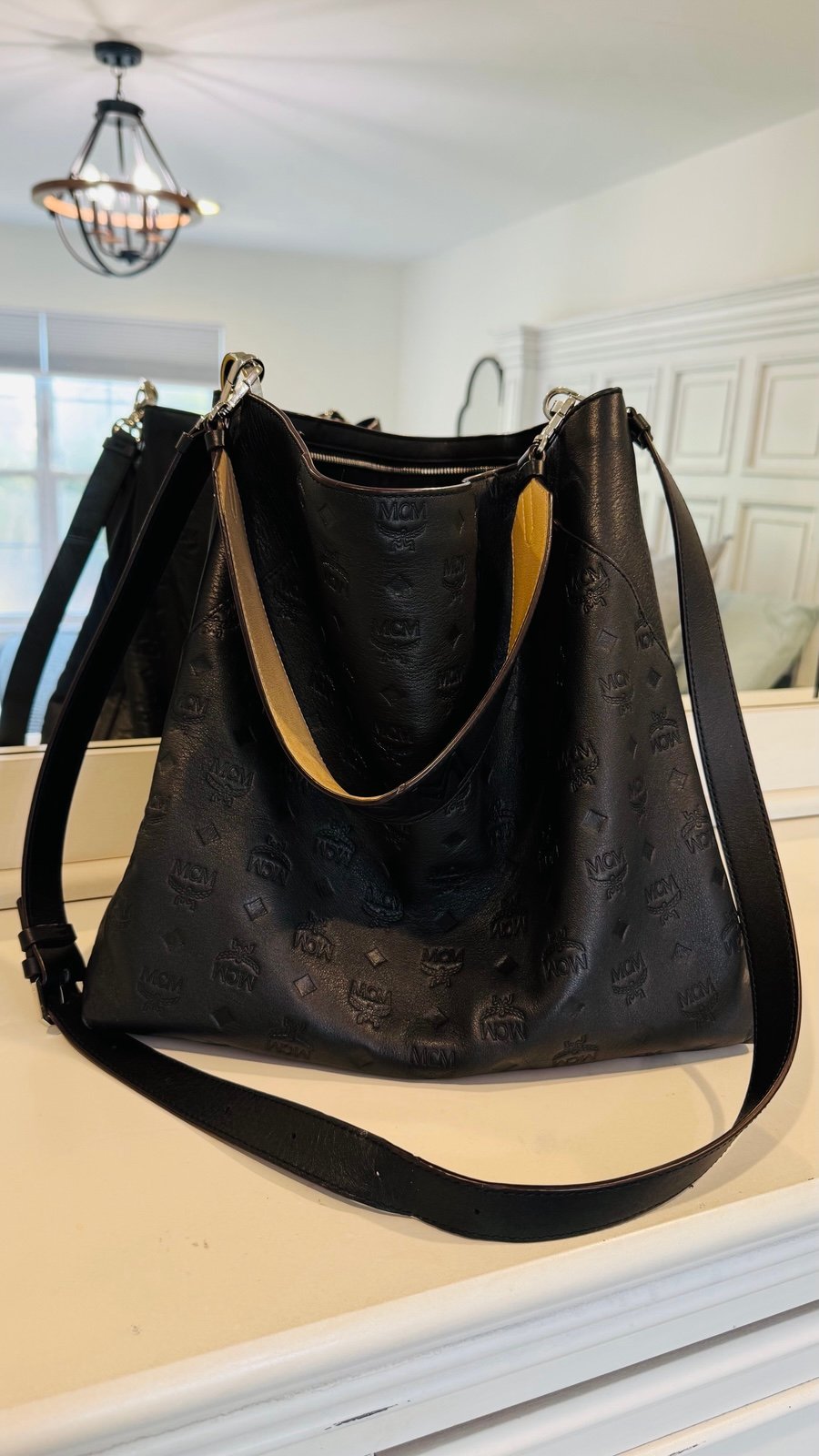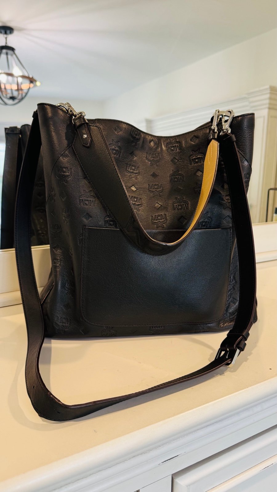 Chic and functional MCM bag featuring the signature embossed logo and a structured flat base. Comes with a removable, reversible shoulder strap and an adjustable crossbody strap for versatile wear.