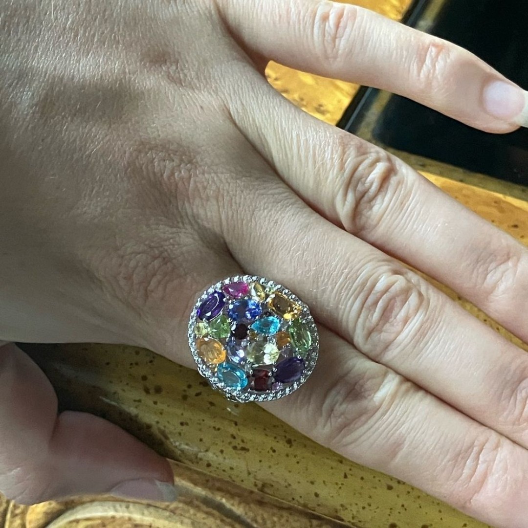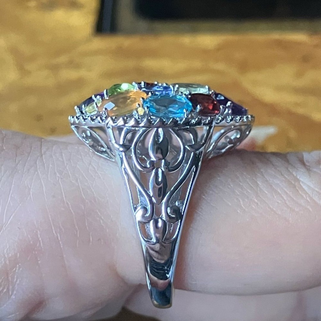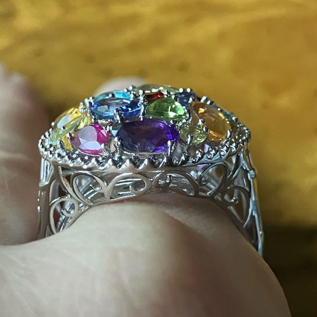 This beautiful ring features an assortment of genuine, earth mined gemstones including garnet, amethyst, tanzanite, fire opal, apatite and ruby. The total gemstone carat weight on the ring is 5.50. The ring is set in solid .925 sterling silver with a rhodium plate to prevent tarnishing. The ring in the photos is the actual one you will receive, so please see photos for gemstone quality and measurements. Size 9.