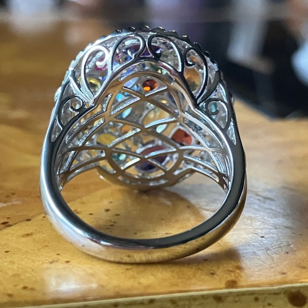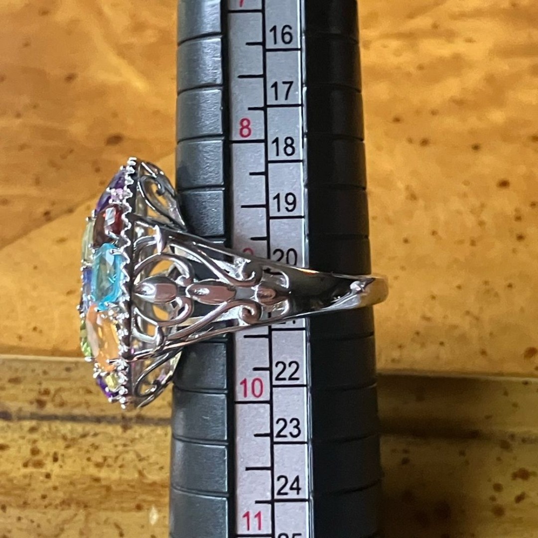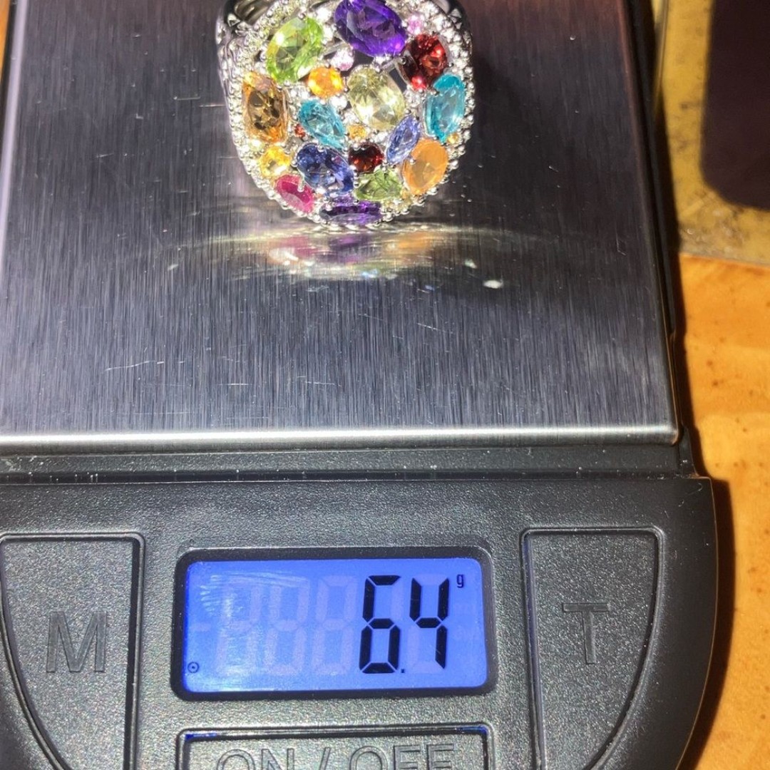 This beautiful ring features an assortment of genuine, earth mined gemstones including garnet, amethyst, tanzanite, fire opal, apatite and ruby. The total gemstone carat weight on the ring is 5.50. The ring is set in solid .925 sterling silver with a rhodium plate to prevent tarnishing. The ring in the photos is the actual one you will receive, so please see photos for gemstone quality and measurements. Size 9.