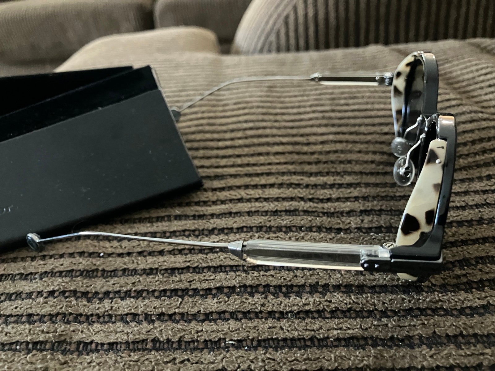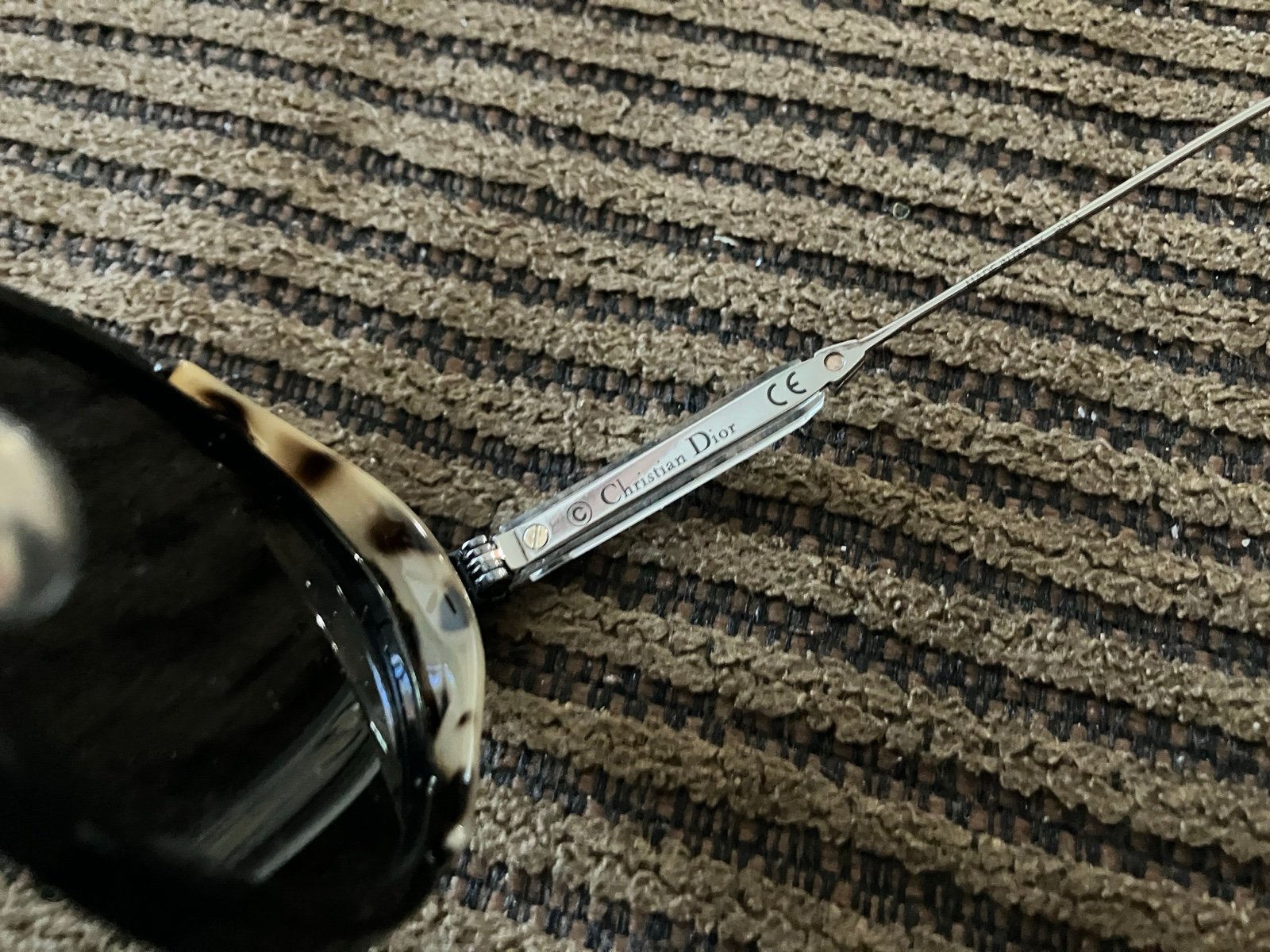 CHRISTIAN DIOR Acetate Umbrage Round Sunglasses in Tortoise and Black. These modern sunglasses feature a bold tortoise shell frame and round mirrored lenses in black. The silver wire arms feature an engraved CD monogram at the temple with studded detail and blue jewel tips. New!