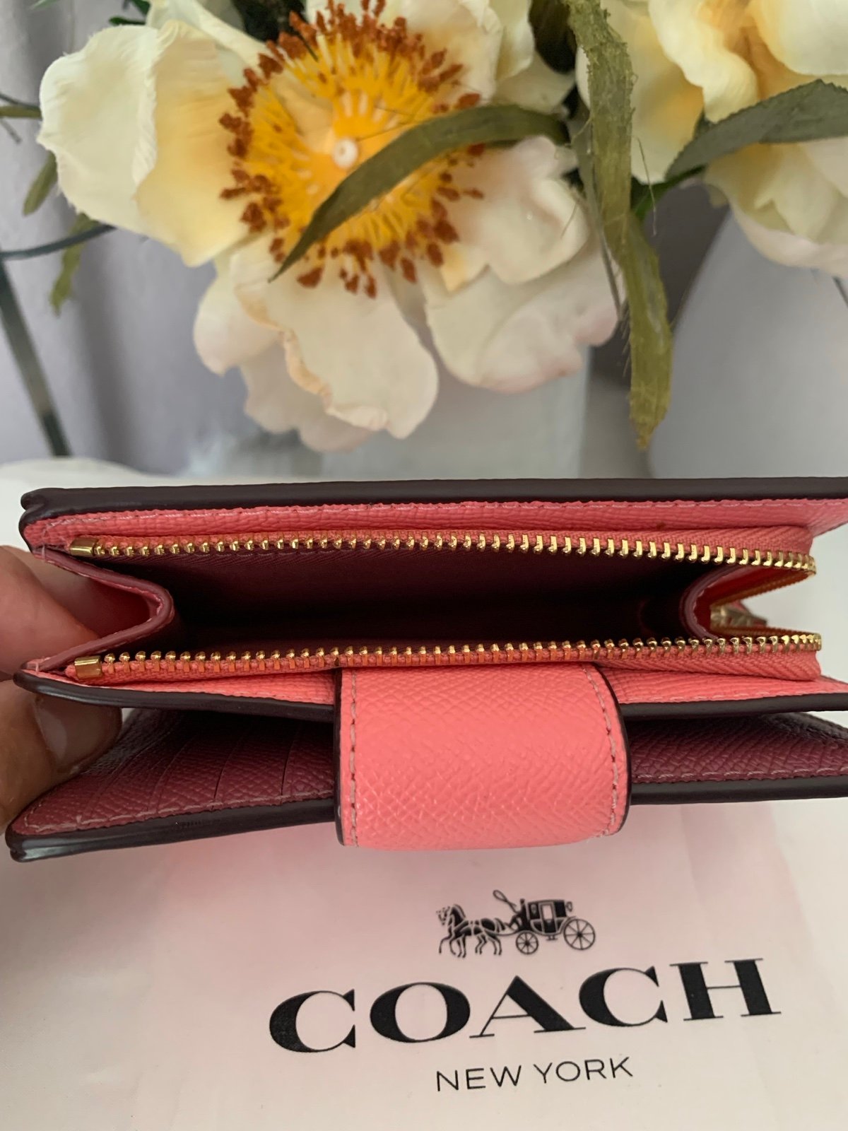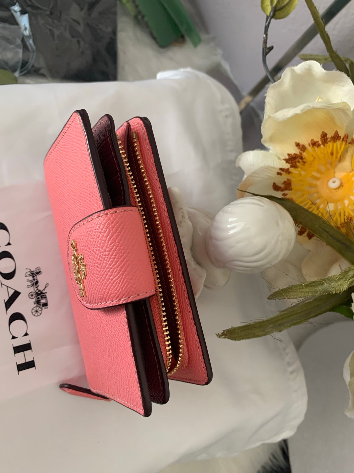 This Coach wallet in a vibrant pink hue features a sleek bifold design, accented with gold-tone logo hardware for a touch of elegance. The smooth leather finish and contrasting black trim highlight the brand's commitment to quality and style. Perfect for adding a pop of color to your spring and summer accessories