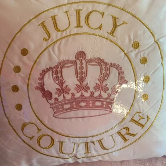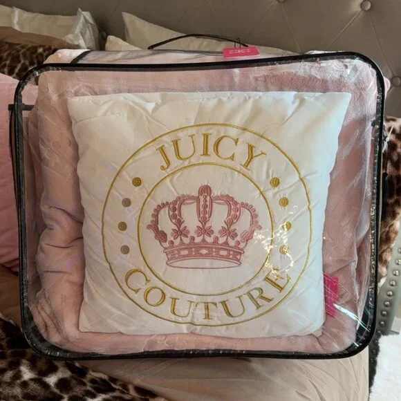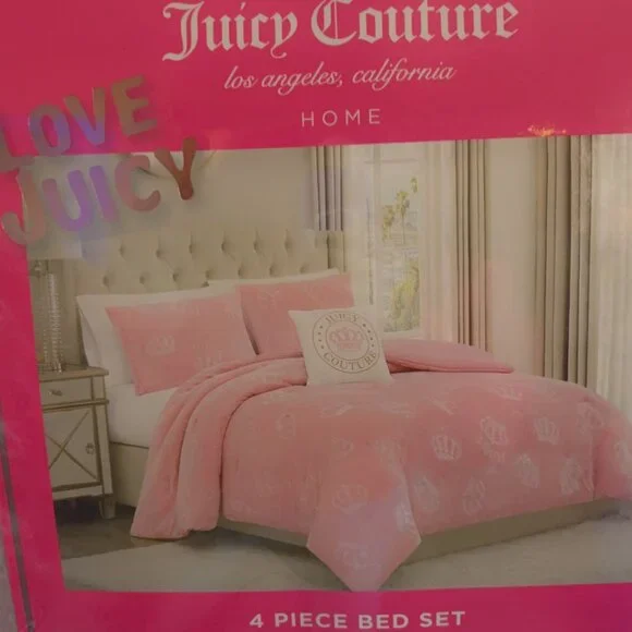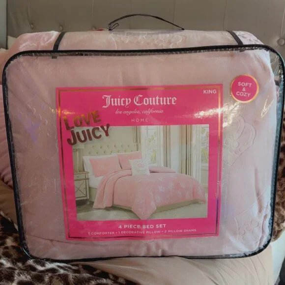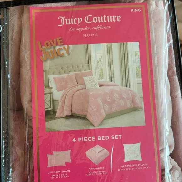 New Juicy Couture 4 piece King Size comforter set. Beautiful dusty blush pink comforter made from the softest coziest velour accented with embossed crowns all over. The opposite side is plain dusty blush pink, it is reversible. Comes with 2 matching pillow shams and one gorgeous decorative throw pillow with an embroidered pink crown and Juicy Couture written in golden accents.