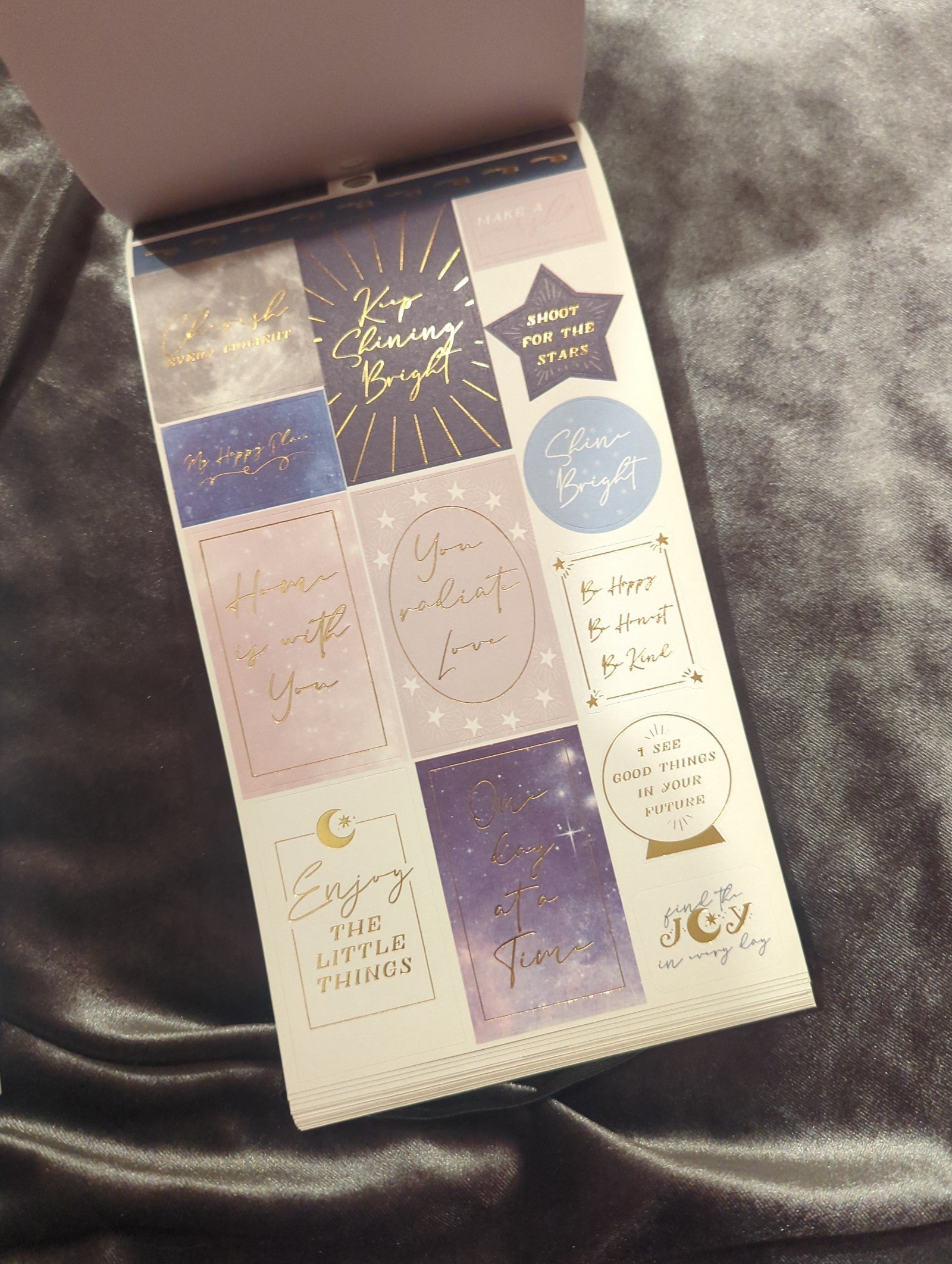 -Sticker book. Unused, 30 sheets with gold foil pages, functional sheets, deco sheets, date dots, text, and more!
