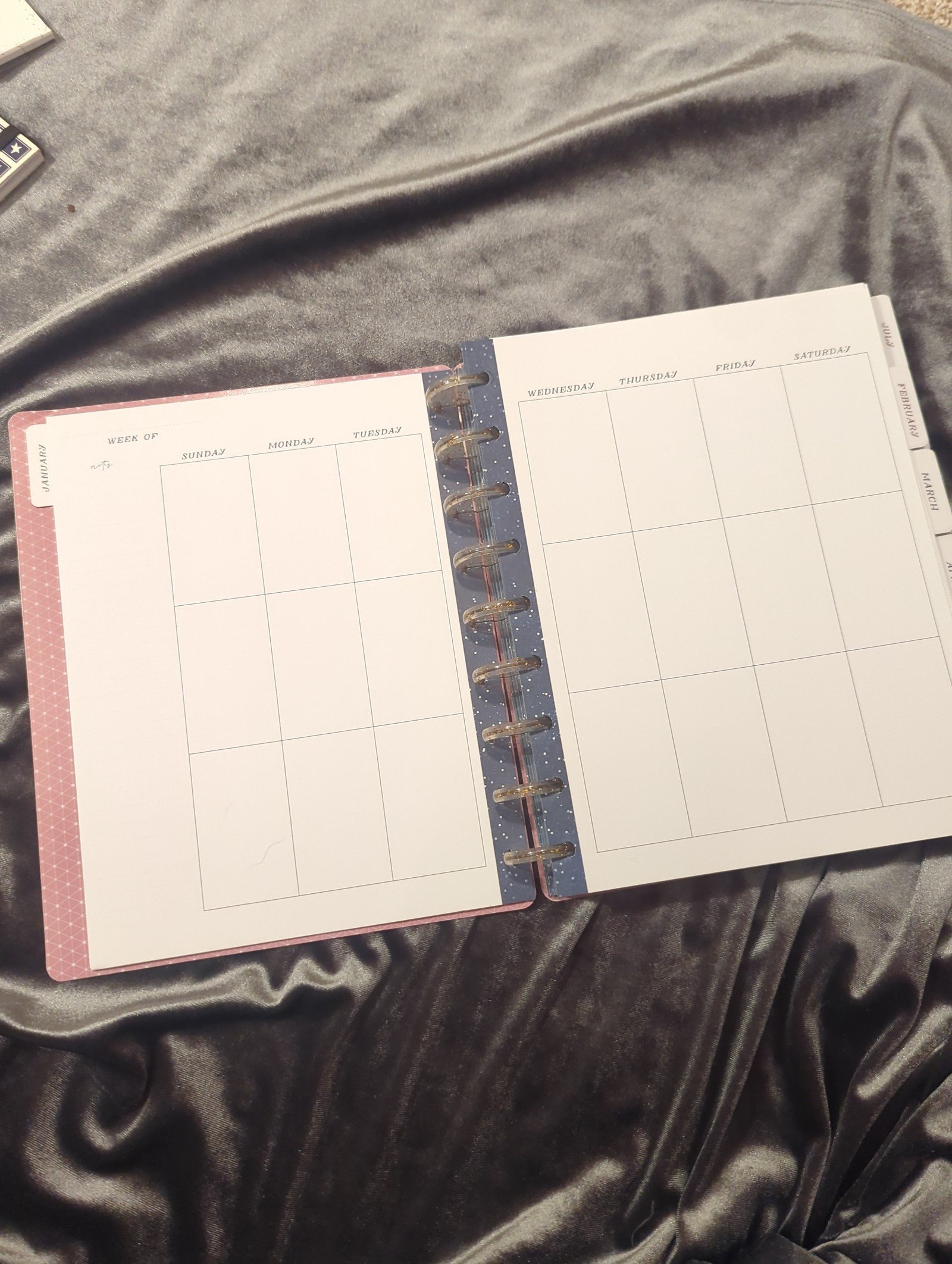 -Undated 18-month planner. Classic size. Clear plastic discs with gold glitter. Each month has a tabbed art page, an overview page, notes page, month view, and standard vertical weekly spreads. Plastic cover has a slight bend on upper right cover.