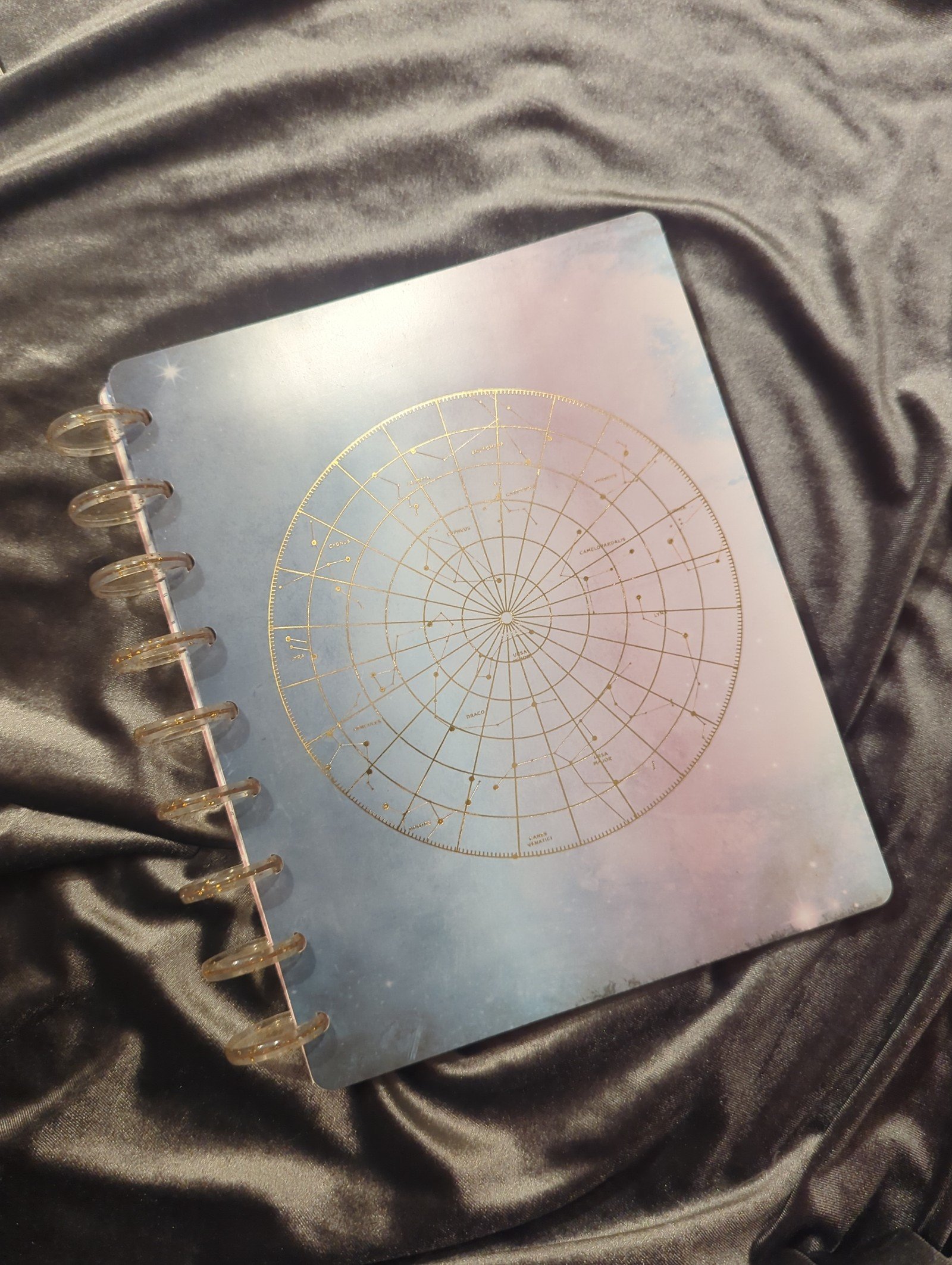-Three Section Notebook. Lined pages, dot pages, graph pages, and deco pages. Gold foil constellations design on cover.
