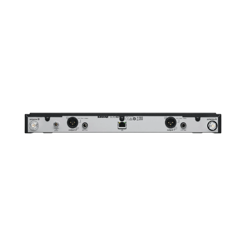 At the heart of the setup is the SLXD4D rackmount receiver. Its dual front-panel antennas use predictive switching diversity to keep the RF link stable, even when performers move across a stage up to 330 feet from the rack. An automatic scan routine finds clean frequencies in seconds, and IR sync locks each transmitter to the receiver with one button press. Separate XLR and quarter-inch outputs on the rear panel simplify routing to mixers, recorders, or powered speakers, while an Ethernet port allows network control or integration with Shure Wireless Workbench software when you manage multiple systems.