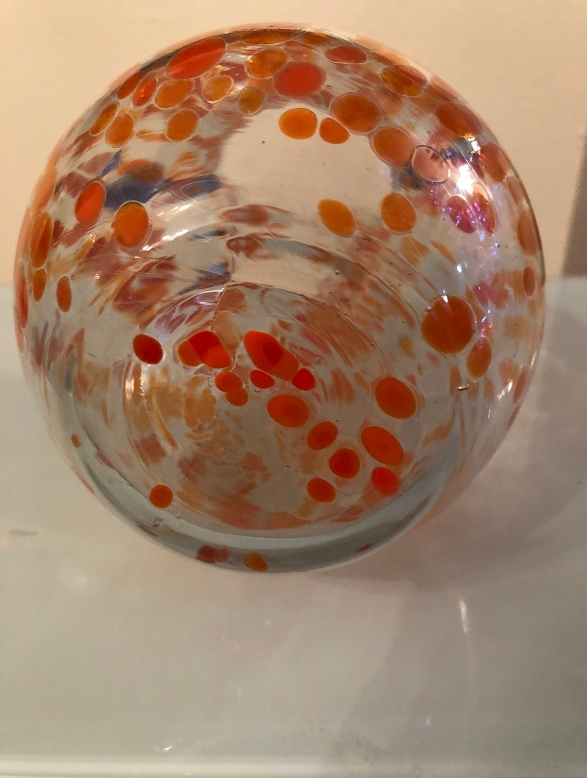 A vintage Fratelli Toso Murano art nouveau glass vase. Aa orange speckled clear glass with blue handles. It was made in Italy in the 1960s. It measures 7 1/2 inches tall. The opening is 2 1/2 inches in diameter. From one end of the handle to the other measures 6 1/4 inches wide. It measures 14 3/4 inches in diameter. It is in perfect condition no breaks no scratches.