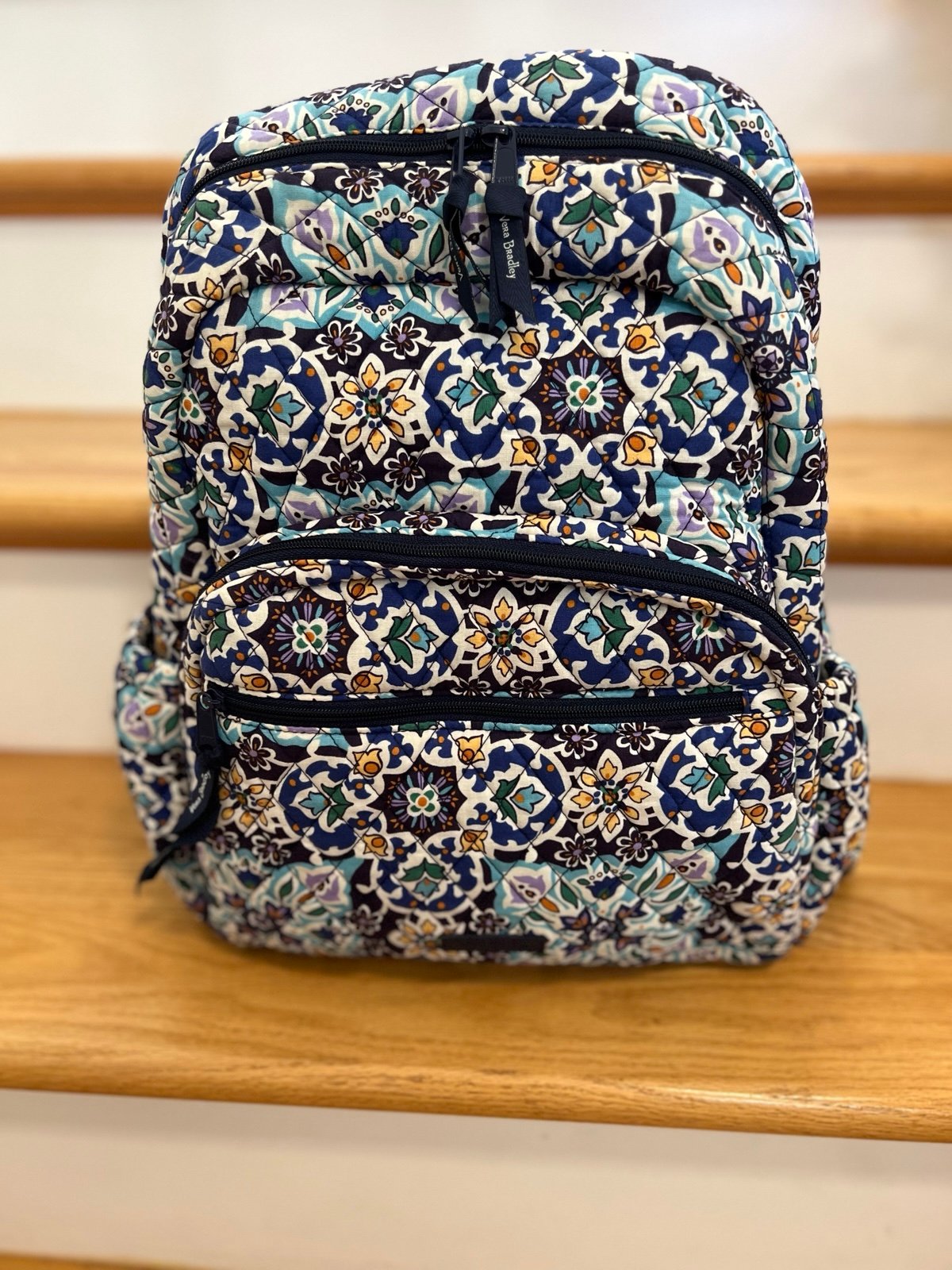 Vera Bradley medium sized backpack. Cushioned adjustable straps. Inside cushioned divider holds small laptop/ipad. 2 outside elastic pockets to hold water bottles. Front compartment opens with pocket & pencil holders. Outside zipper pocket on compartment. 16 in H x 11.5 W x 5.5 D. Smoke free/pet free home.
