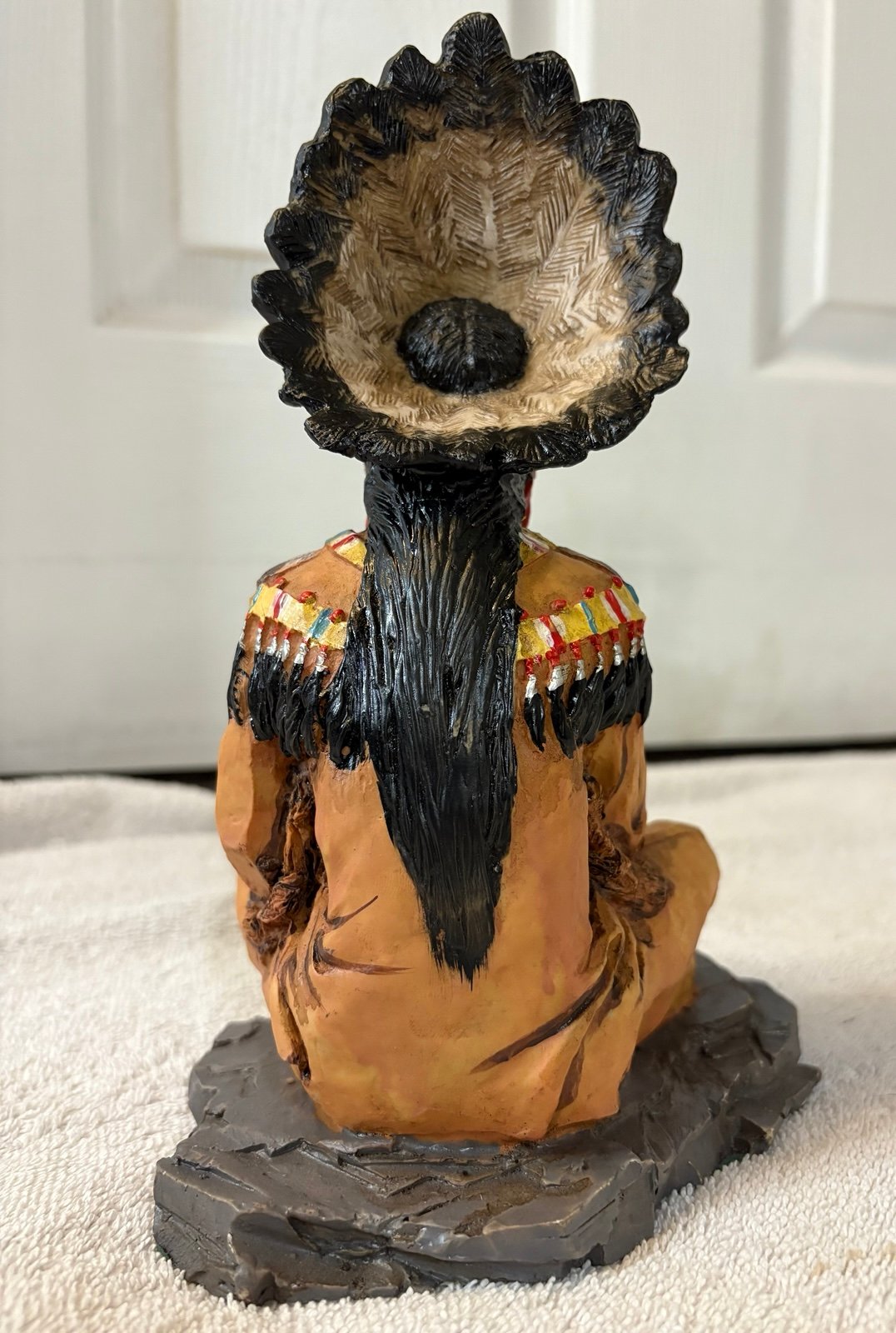 The Vintage Old West Visions Native American Figurine is a unique collectible piece that captures the essence of Native American culture from the US. This sculpture depicts a vision of the Old West, highlighting the rich traditions and history of the indigenous people. With a focus on the intricate details and craftsmanship, this figurine is a timeless addition to any collection dedicated to showcasing the beauty and resilience of Native American heritage. This vibrant, detailed Old West Visions figurine features a Native American Indian chief working with a knife and stone. Good Condition, Original Condition Unaltered, Some Imperfections