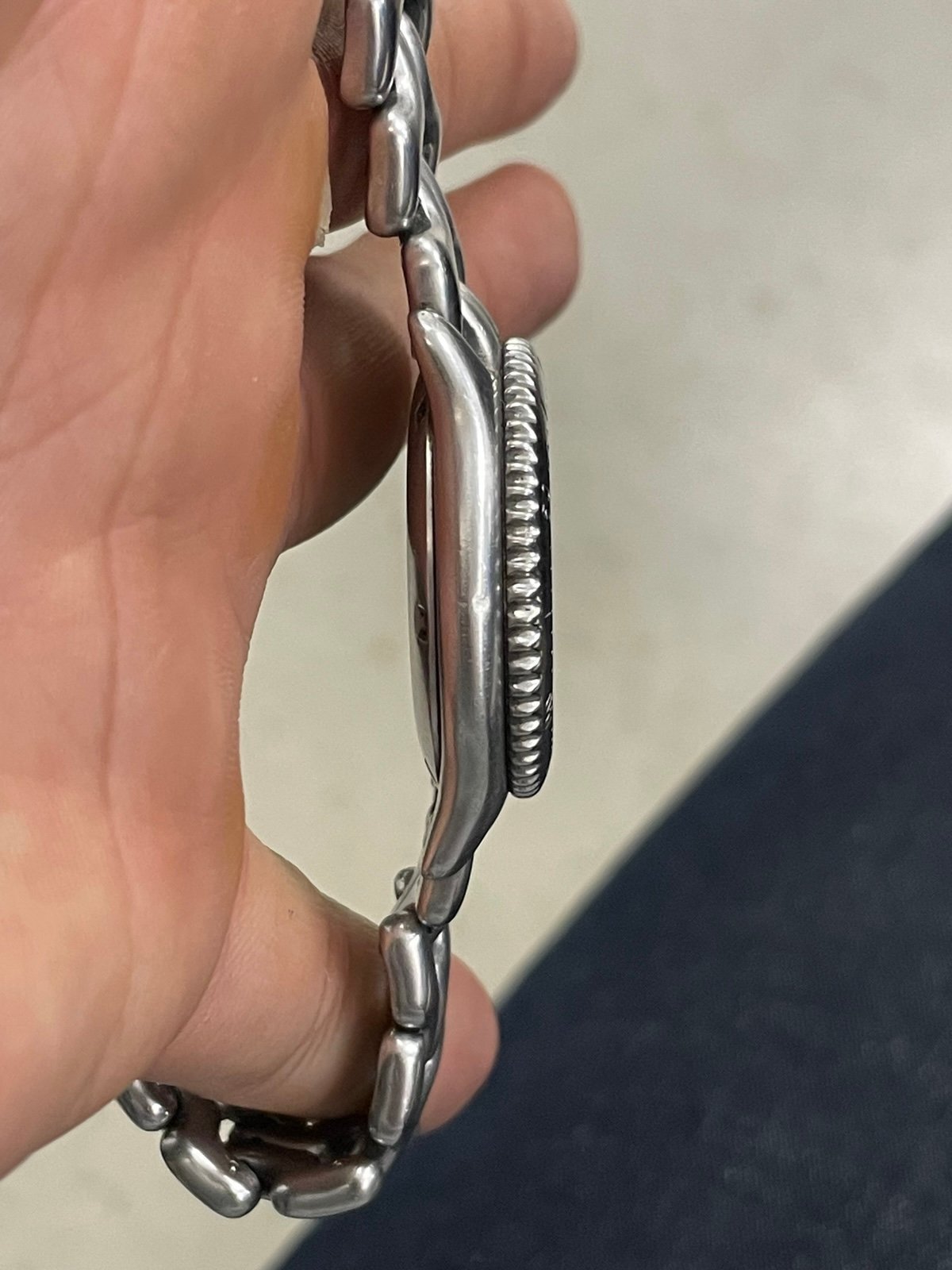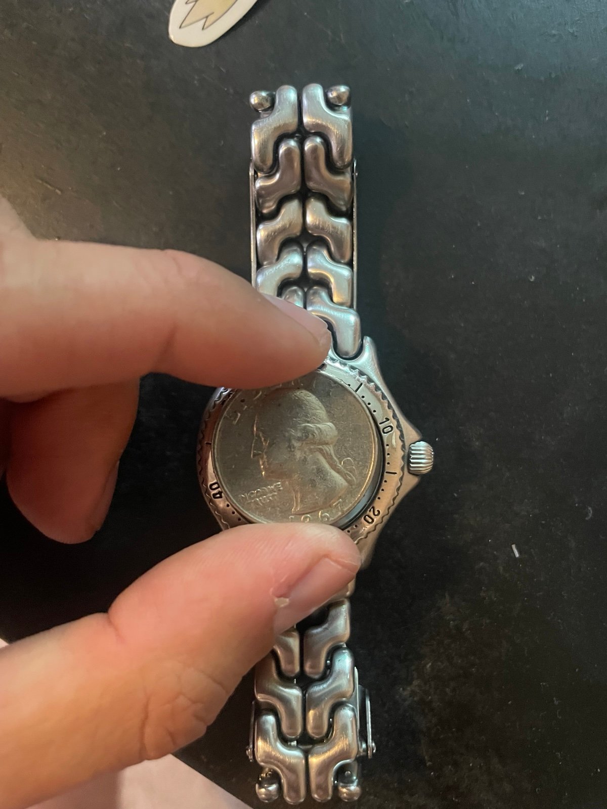 A vintage watch from the 80s from Tag Heuer. Very small watch, I’m a 6.5” wrist but have extra links. Sapphire crystal, automatic movement, Calibre 5, unidirectional bezel. This is a midsize watch so it can be unisex. Had it for a while so there’s minor scratches and scuffs but works like a champ.
