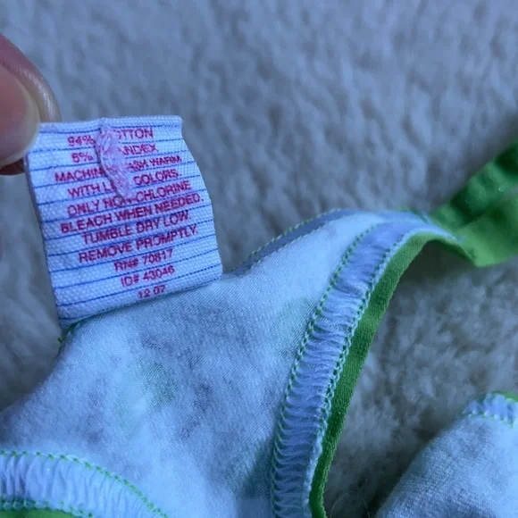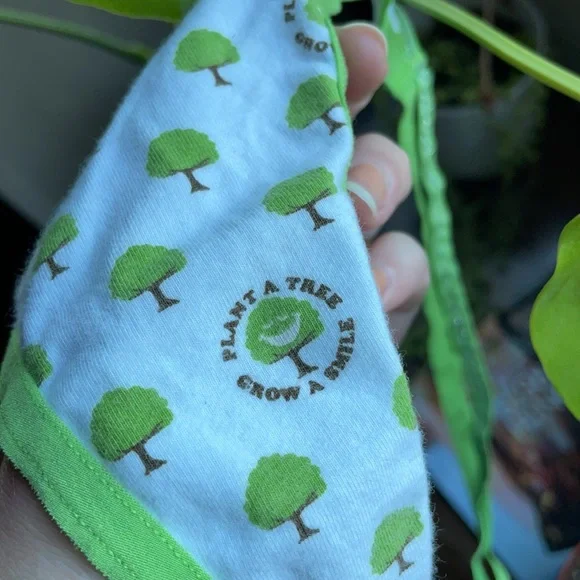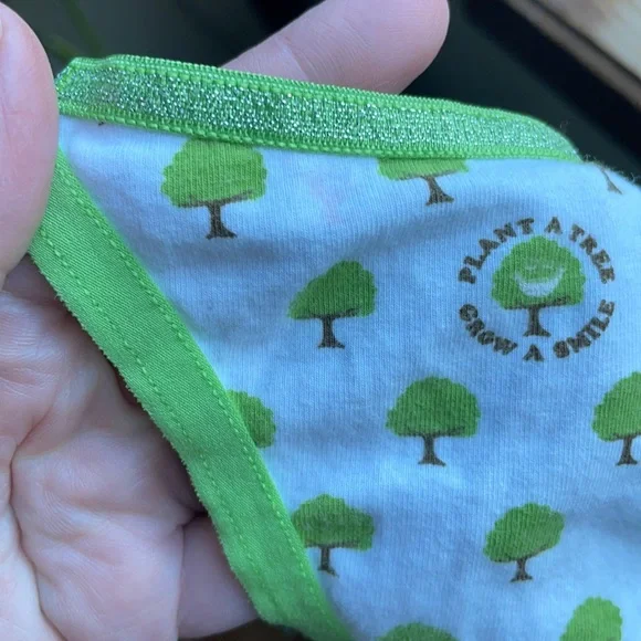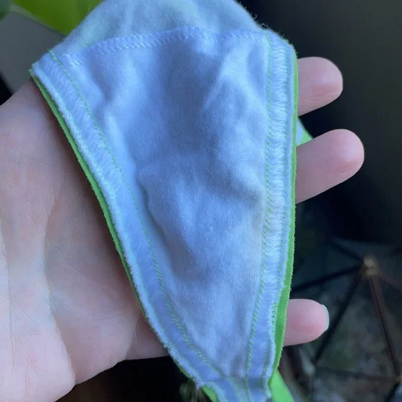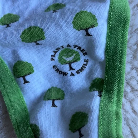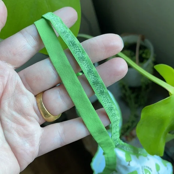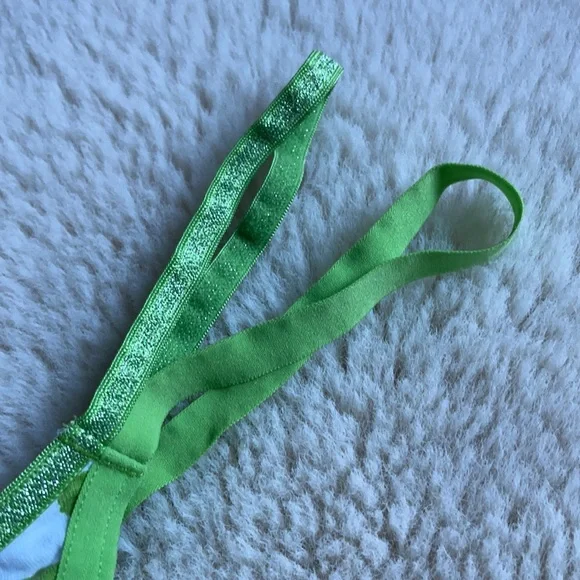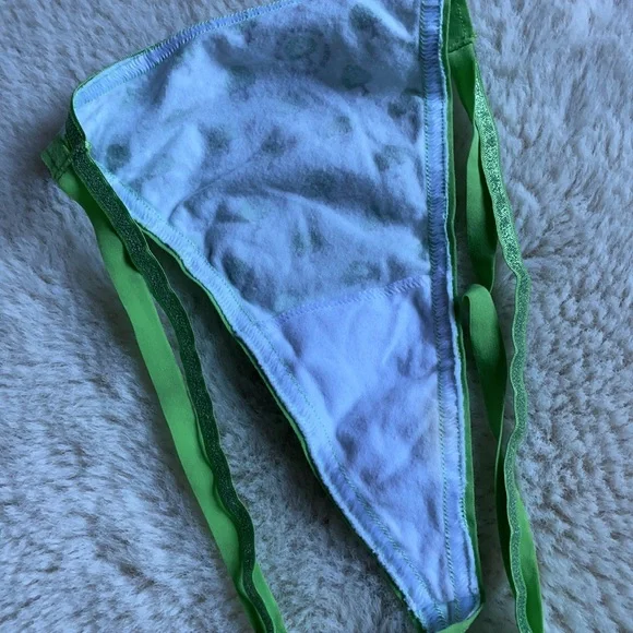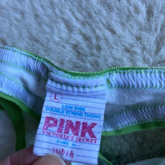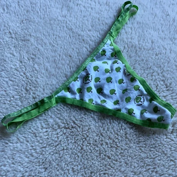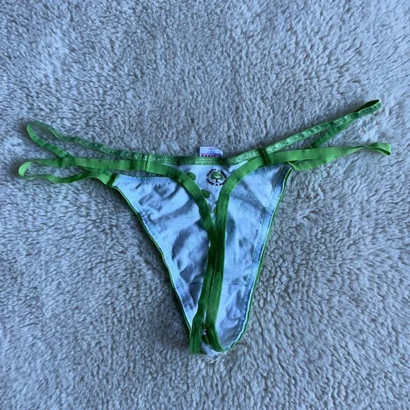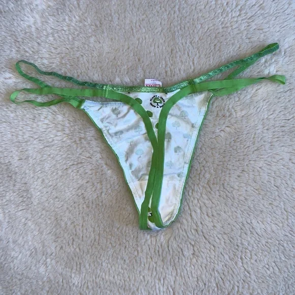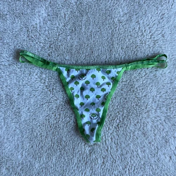 Y2K VS PINK Low Rise Double String Thong in white with green tree print ‘Plant A Tree Grow A Smile.’ Double elastic straps in light green and metallic green. Absolutely adorable, rare style print and size. A must have for the die hard PINK collector! Small faint pink spot on front near hip. Slight discoloration on liner. Overall good vintage condition. • 94% Cotton • 6% Spandex • Size Large