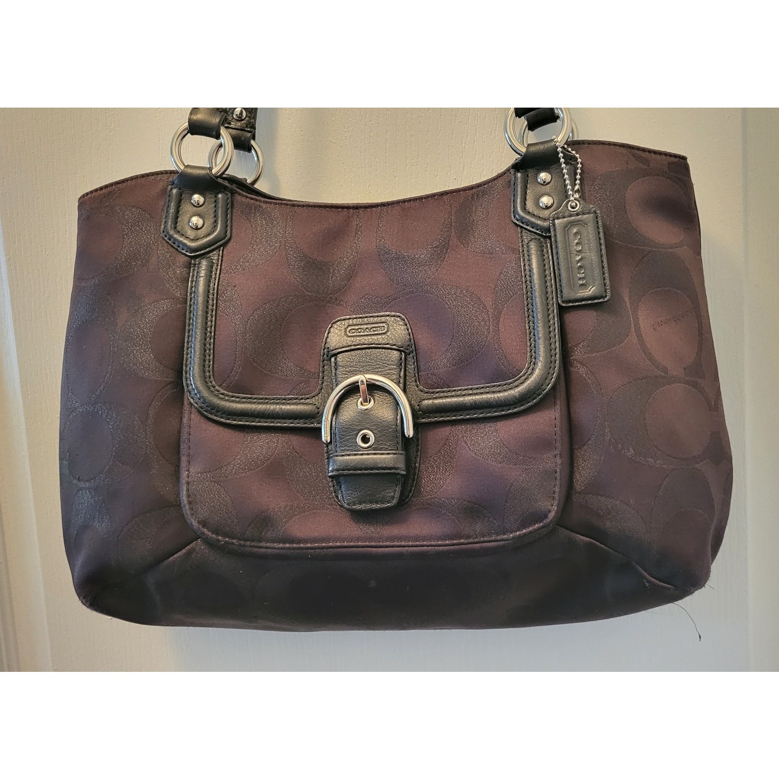 The Y2K Coach Campbell Signature Belle Carryall Black Canvas Shoulder Bag is a vintage piece from 2001, featuring the iconic Coach Campbell Belle logo. This large rectangular shoulder bag has a classic black exterior made of satin fabric with leather trim and silver hardware accents. It comes with a double black leather handle/strap, a zip and snap closure, and inner dividers for organization. Perfect for everyday use, this versatile bag can be worn for travel, parties, casual outings, workwear, or business meetings, making it a must-have accessory for any fashion-forward woman looking to add a touch of timeless elegance to her wardrobe.